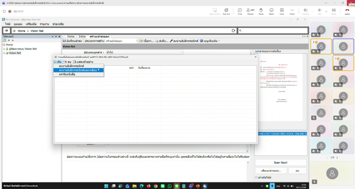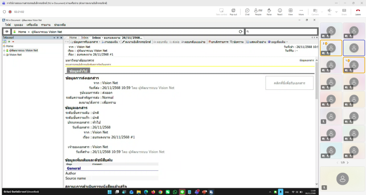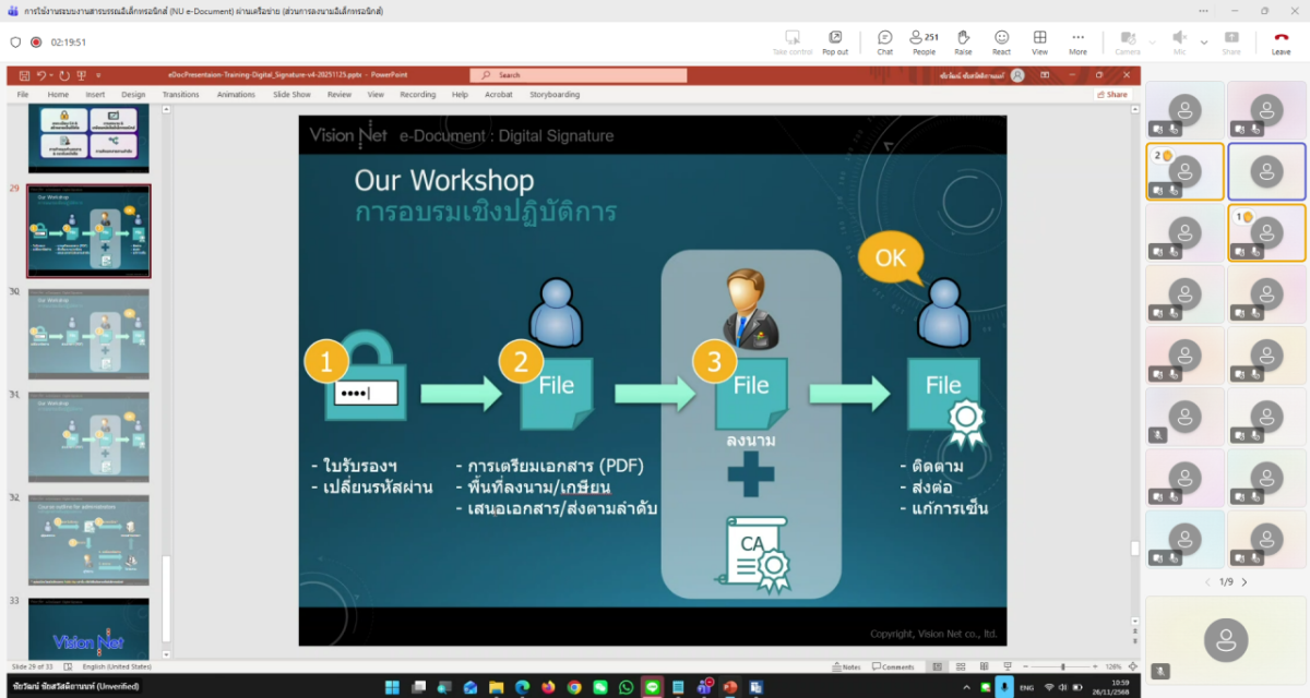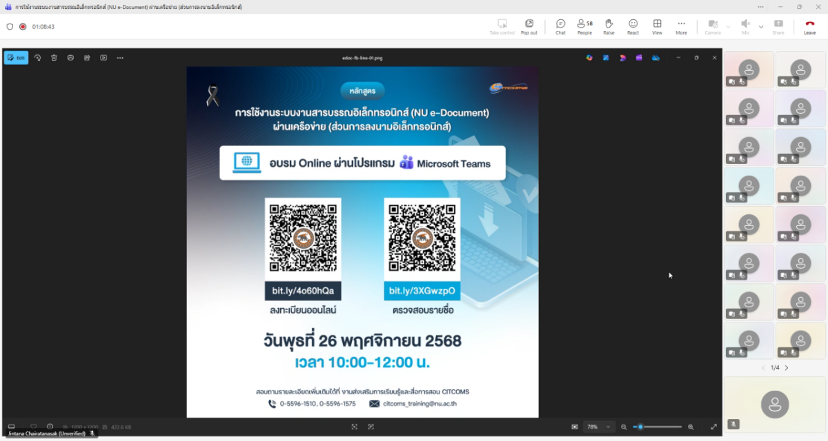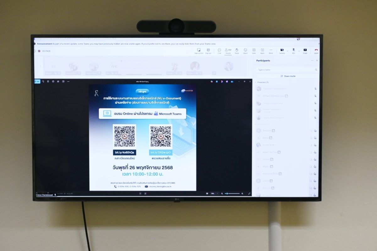 เมื่อวันที่ 26 พฤศจิกายน 2568 CITCOMS จัดการอบรมหลักสูตร “การใช้งานระบบงานสารบรรณอิเล็กทรอนิกส์ (NU e-Document) ผ่านเครือข่าย (ส่วนการลงนามอิเล็กทรอนิกส์)” ผ่านทางระบบ Microsoft Teams ให้ผู้ปฏิบัติงานด้านงานสารบรรณของหน่วยงาน เพื่อเรียนรู้ขั้นตอนการลงนามอิเล็กทรอนิกส์ (e-Signature) การเกษียณเอกสาร การกำหนดค่าเอกสาร การประทับตรารับเอกสาร รวมถึงการส่งเอกสารต่อ เพื่อสนับสนุนให้ทุกหน่วยงานมีการใช้งานระบบงานสารบรรณอิเล็กทรอนิกส์ (NU e-Document) อย่างเด็มรูปแบบอย่างมีประสิทธิภาพ และให้เป็นไปตามประกาศมหาวิทยาลัยนเรศวร เรื่อง หลักเกณฑ์และวิธีการใช้ลายมือชื่ออิเล็กทรอนิกส์ของมหาวิทยาลัยนเรศวร (ประกาศ ณ วันที่ 7 มกราคม 2568)