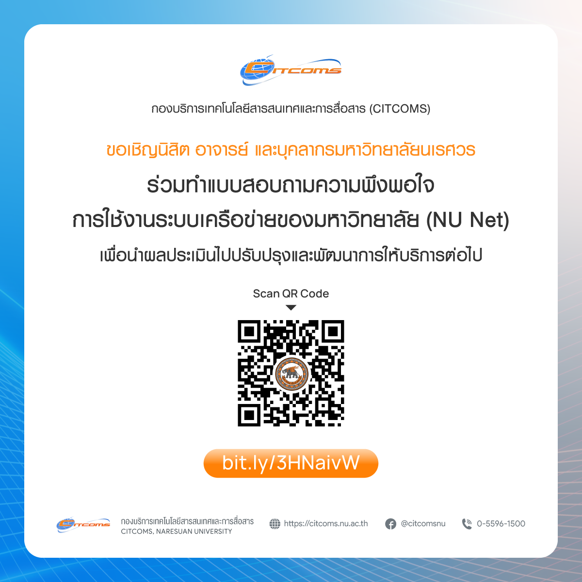 ขอเชิญประชาคม ม.นเรศวร ร่วมทำแบบสอบถามความพึงพอใจการใช้งานระบบเครือข่าย NU Net