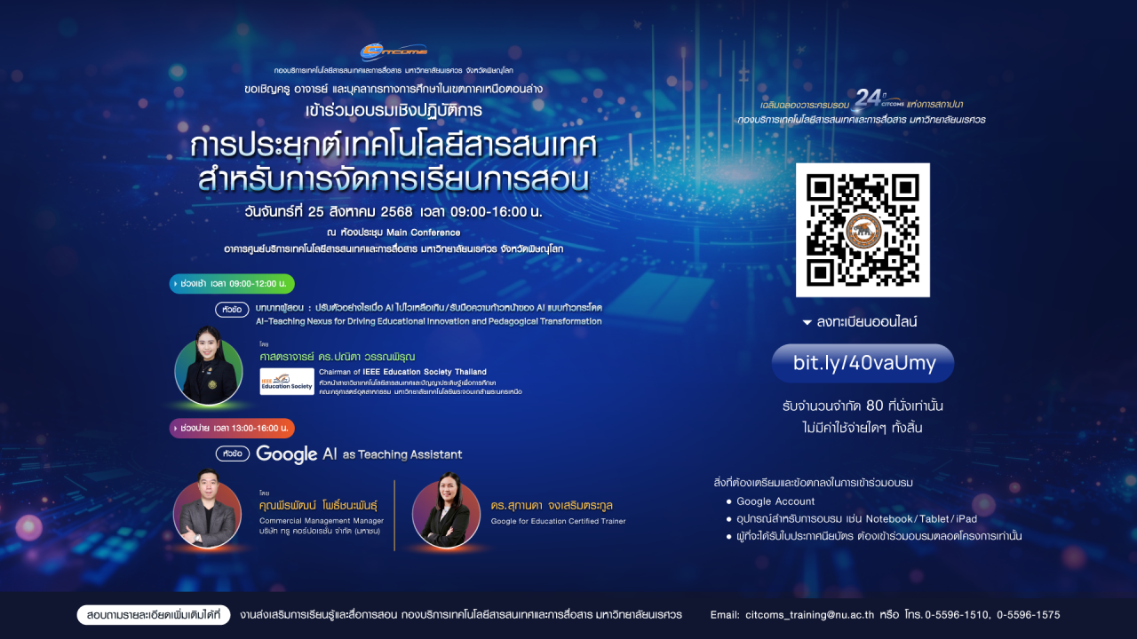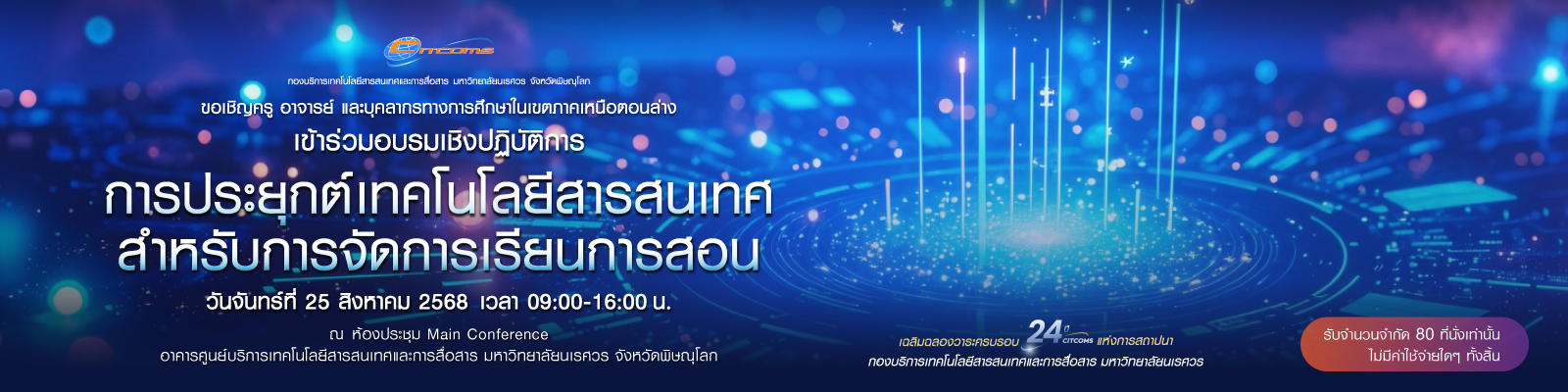 กองบริการเทคโนโลยีสารสนเทศและการสื่อสาร (CITCOMS) มหาวิทยาลัยนเรศวร จังหวัดพิษณุโลก จัดโครงการอบรมเชิงปฏิบัติการ การประยุกต์เทคโนโลยีสารสนเทศสำหรับการจัดการเรียนการสอน ในวันจันทร์ที่ 25 สิงหาคม 2568 เวลา 09:00-16:00 น. ณ อาคารศูนย์บริการเทคโนโลยีสารสนเทศและการสื่อสาร มหาวิทยาลัยนเรศวร จังหวัดพิษณุโลก โดยเปิดโอกาสให้ครู อาจารย์ และบุคลากรทางการศึกษา ในเขคภาคเหนือตอนล่าง ได้เข้าร่วมแลกเปลี่ยนเรียนรู้ มุมมอง วิธีการ แนวคิด จากผู้ที่มีประสบการณ์ / ผู้ที่ประสบความสำเร็จในด้านการนำเอาเทคโนโลยีสารสนเทศมาประยุกต์ใช้กับการเรียนการสอน เพื่อให้ผู้เข้าร่วมโครงการได้นำเอาเทคโนโลยีสารสนเทศมาประยุกต์ใช้ และพัฒนารูปแบบการจัดการเรียนการสอนในยุคปัจจุบันได้อย่างเหมาะสม