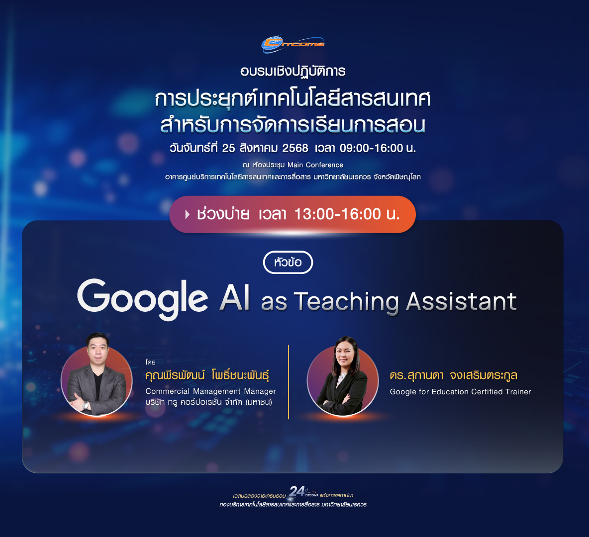 กองบริการเทคโนโลยีสารสนเทศและการสื่อสาร (CITCOMS) มหาวิทยาลัยนเรศวร จังหวัดพิษณุโลก จัดโครงการอบรมเชิงปฏิบัติการ การประยุกต์เทคโนโลยีสารสนเทศสำหรับการจัดการเรียนการสอน ในวันจันทร์ที่ 25 สิงหาคม 2568 เวลา 09:00-16:00 น. ณ อาคารศูนย์บริการเทคโนโลยีสารสนเทศและการสื่อสาร มหาวิทยาลัยนเรศวร จังหวัดพิษณุโลก โดยเปิดโอกาสให้ครู อาจารย์ และบุคลากรทางการศึกษา ในเขคภาคเหนือตอนล่าง ได้เข้าร่วมแลกเปลี่ยนเรียนรู้ มุมมอง วิธีการ แนวคิด จากผู้ที่มีประสบการณ์ / ผู้ที่ประสบความสำเร็จในด้านการนำเอาเทคโนโลยีสารสนเทศมาประยุกต์ใช้กับการเรียนการสอน เพื่อให้ผู้เข้าร่วมโครงการได้นำเอาเทคโนโลยีสารสนเทศมาประยุกต์ใช้ และพัฒนารูปแบบการจัดการเรียนการสอนในยุคปัจจุบันได้อย่างเหมาะสม