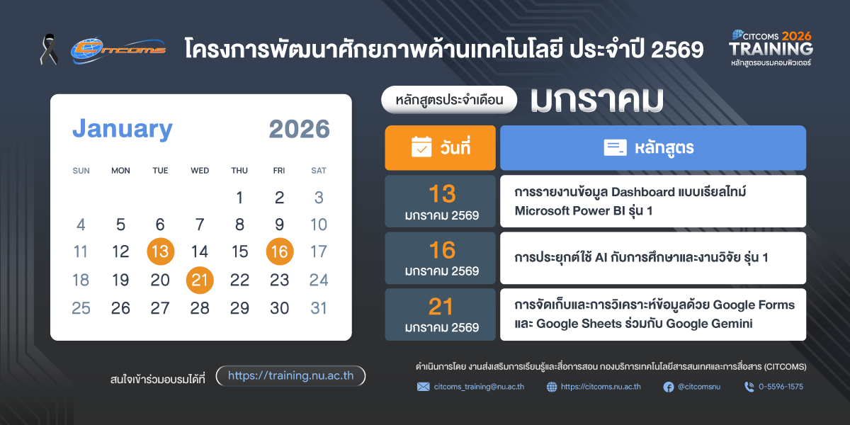 📞 สอบถาม โทร. 0-5596-1575 คุณปณิดา ภานุไพศาล หรือ e-Mail : citcoms_training@nu.ac.th