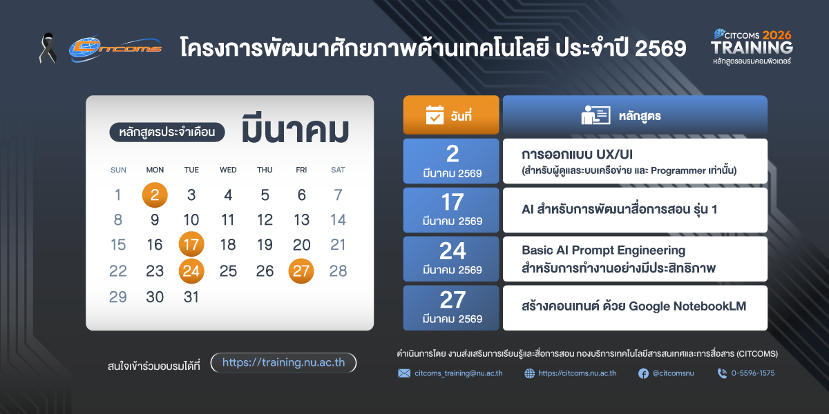 สอบถาม โทร. 0-5596-1575 คุณปณิดา ภานุไพศาล หรือ e-Mail : citcoms_training@nu.ac.th
