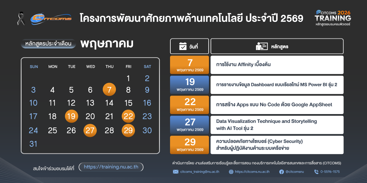 📞 สอบถาม โทร. 0-5596-1575 คุณปณิดา ภานุไพศาล หรือ e-Mail : citcoms_training@nu.ac.th